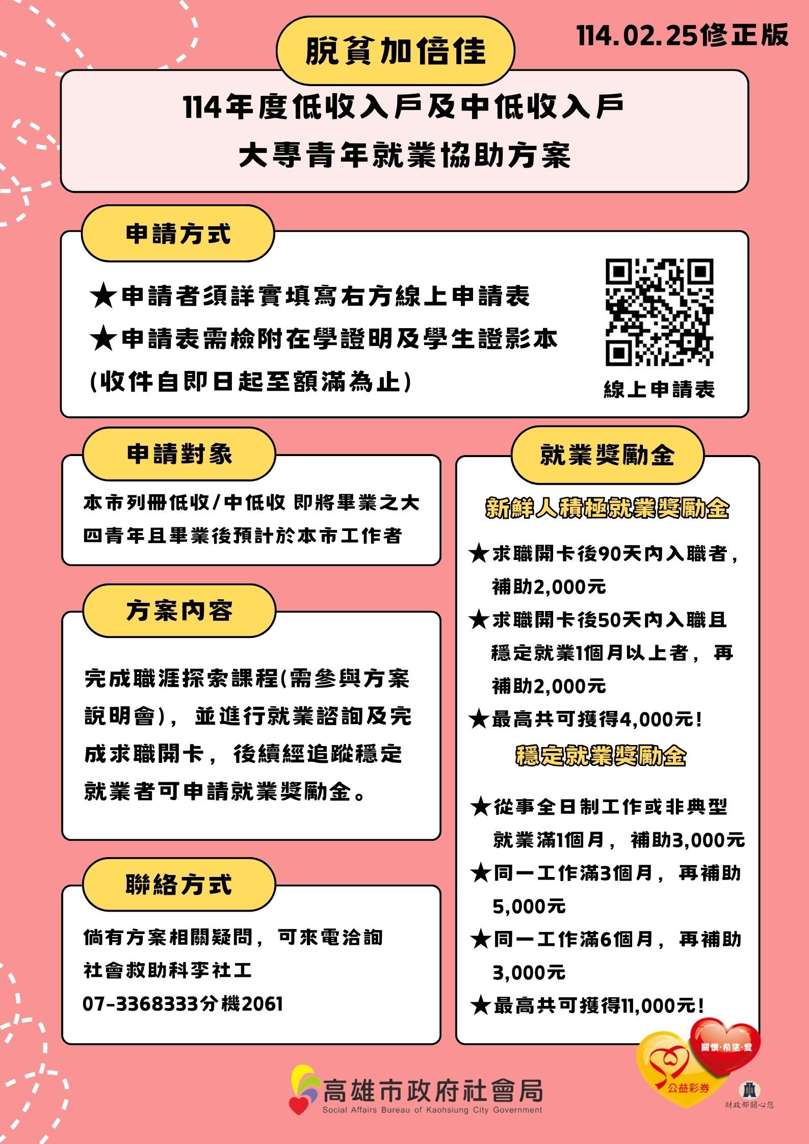 【日夜均可/限高雄市列冊中、低收/限大四/限畢業後在高雄市工作/生輔組獎助學金訊息】高雄市政府社會局「脫貧加倍佳—114年度低收入戶及中低收入戶大專青年就業協助方案」(即日起自行寄件申請)